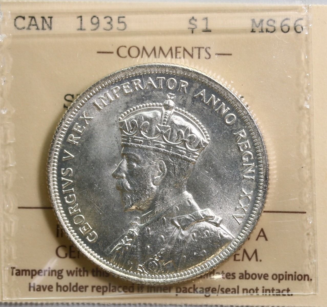 1935 $1 "SWL - Rear SWL - Dbl Voyageur" ICCS Superb Gem Mint State-66 Rare "Triple" Variety With Nice Eye Appeal. This example of the sought after "SWL" variety may be quite unique. We have offered a few other "SWL" examples in the past however this is the first one with three distinct varieties on the same coin. All in all, this is a fascinating study piece and a very scarce variety. A unique and noteworthy opportunity for the conscious silver dollar variety collector.