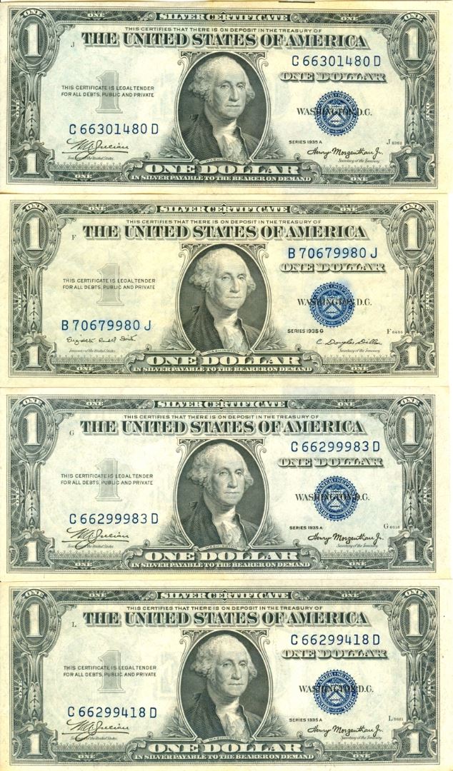 1935 $1 Silver Certificate Lot of 4 Assorted Bills. Pictures represent the bills.