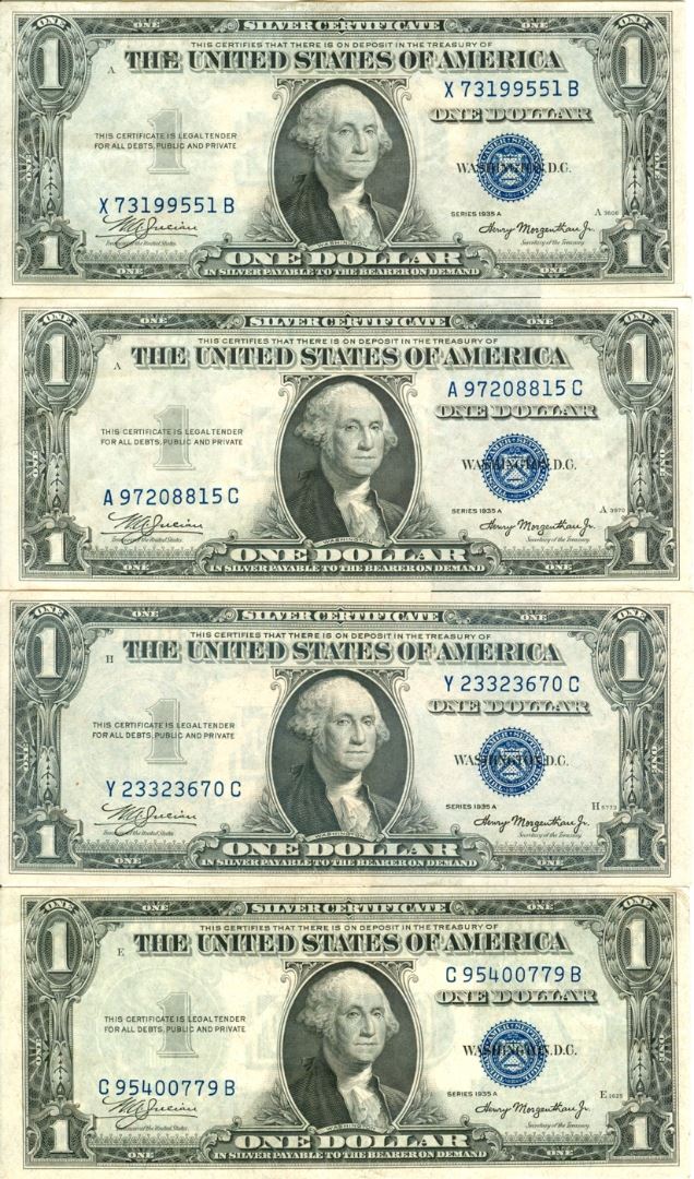 1935 $1 Silver Certificate Lot of 4 Assorted Bills. Pictures represent the bills.