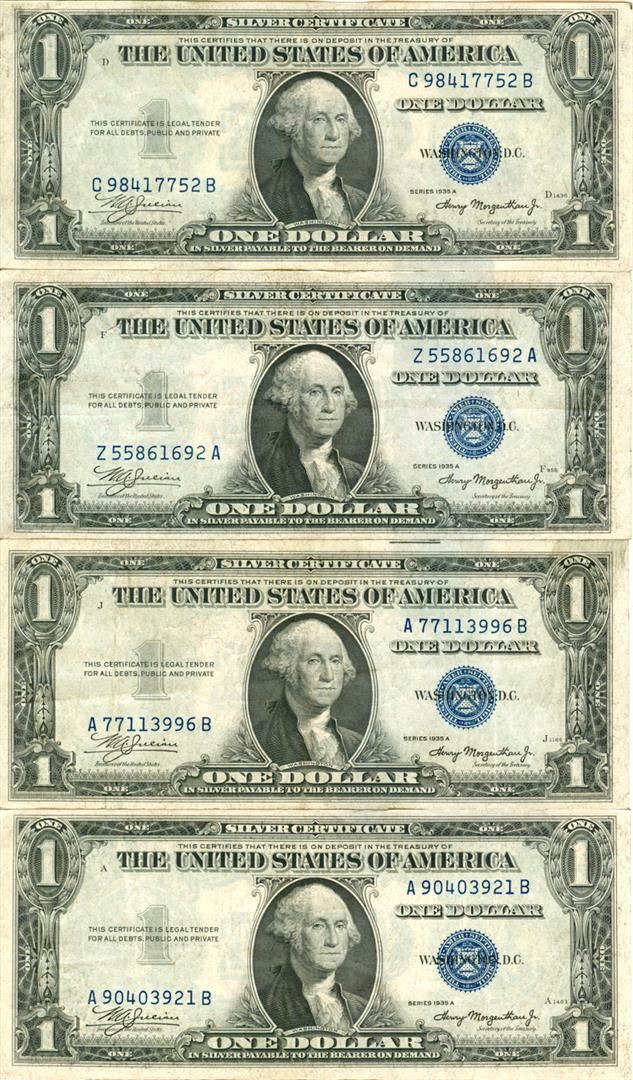 1935 $1 Silver Certificate Lot of 4 Assorted Bills. Pictures represent the bills.