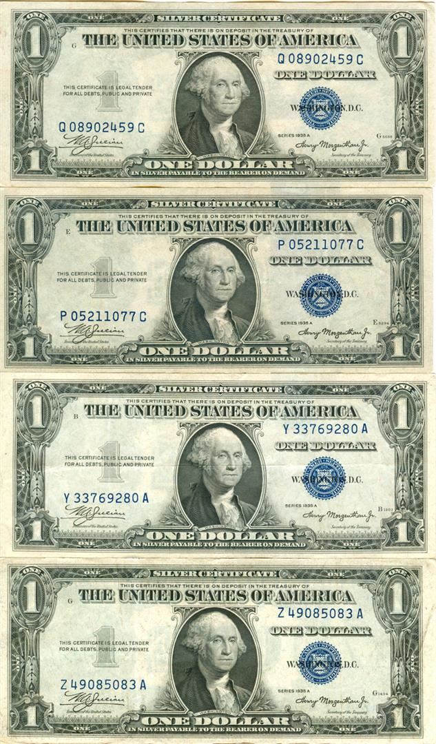1935 $1 Silver Certificate Lot of 4 Assorted Bills. Pictures represent the bills.