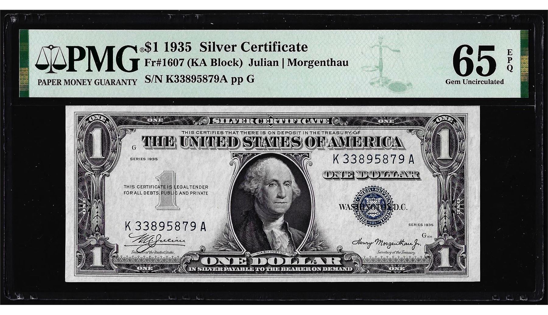 One 1935 $1 Silver Certificate Note Fr.1607 PMG Gem Uncirculated 65EPQ.
