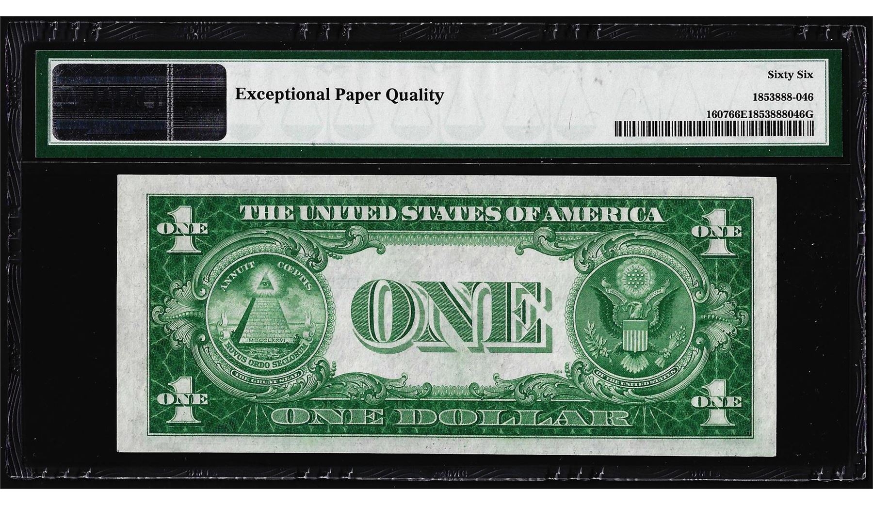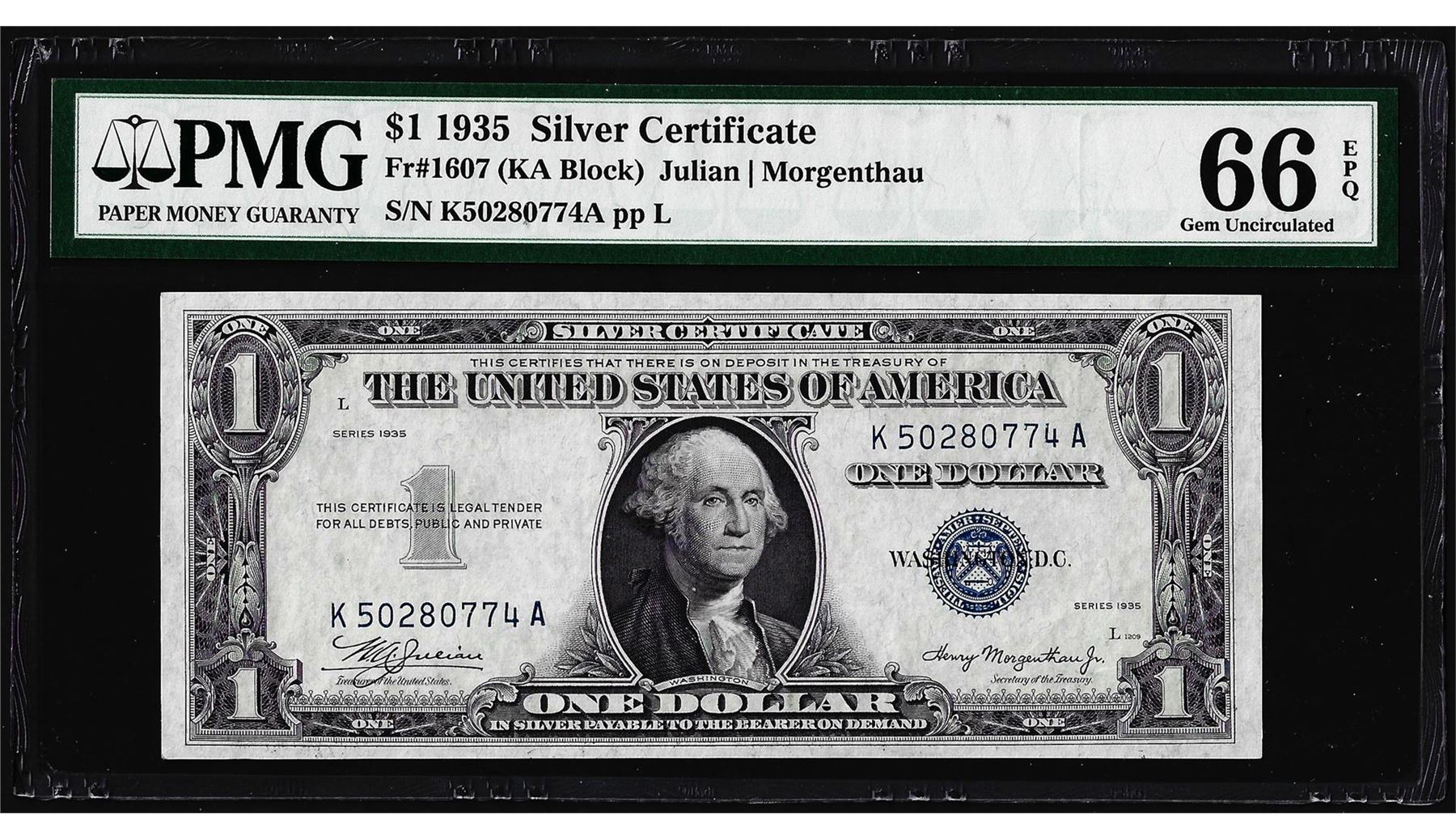 One 1935 $1 Silver Certificate Note Fr.1607 PMG Gem Uncirculated 66EPQ. PMG Certified.