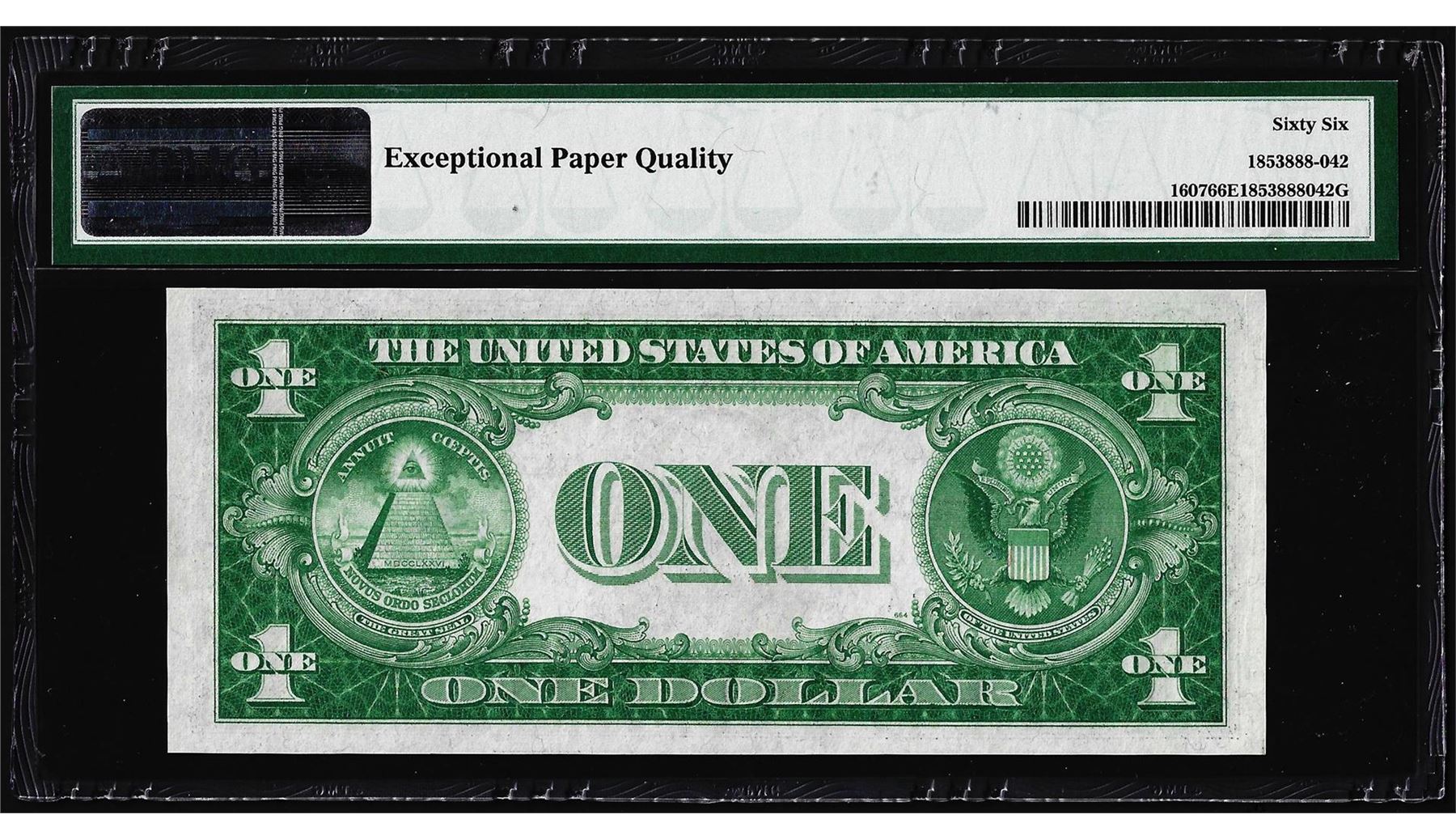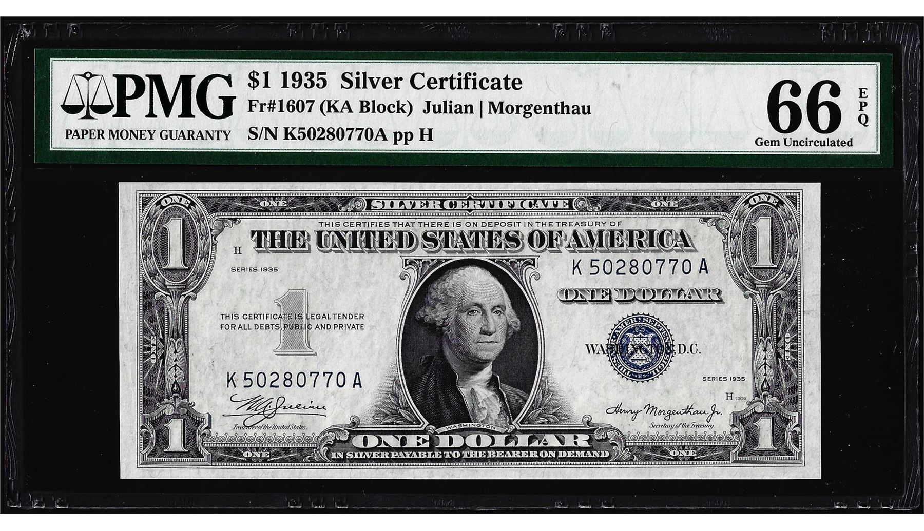 One 1935 $1 Silver Certificate Note Fr.1607 PMG Gem Uncirculated 66EPQ. PMG Certified.
