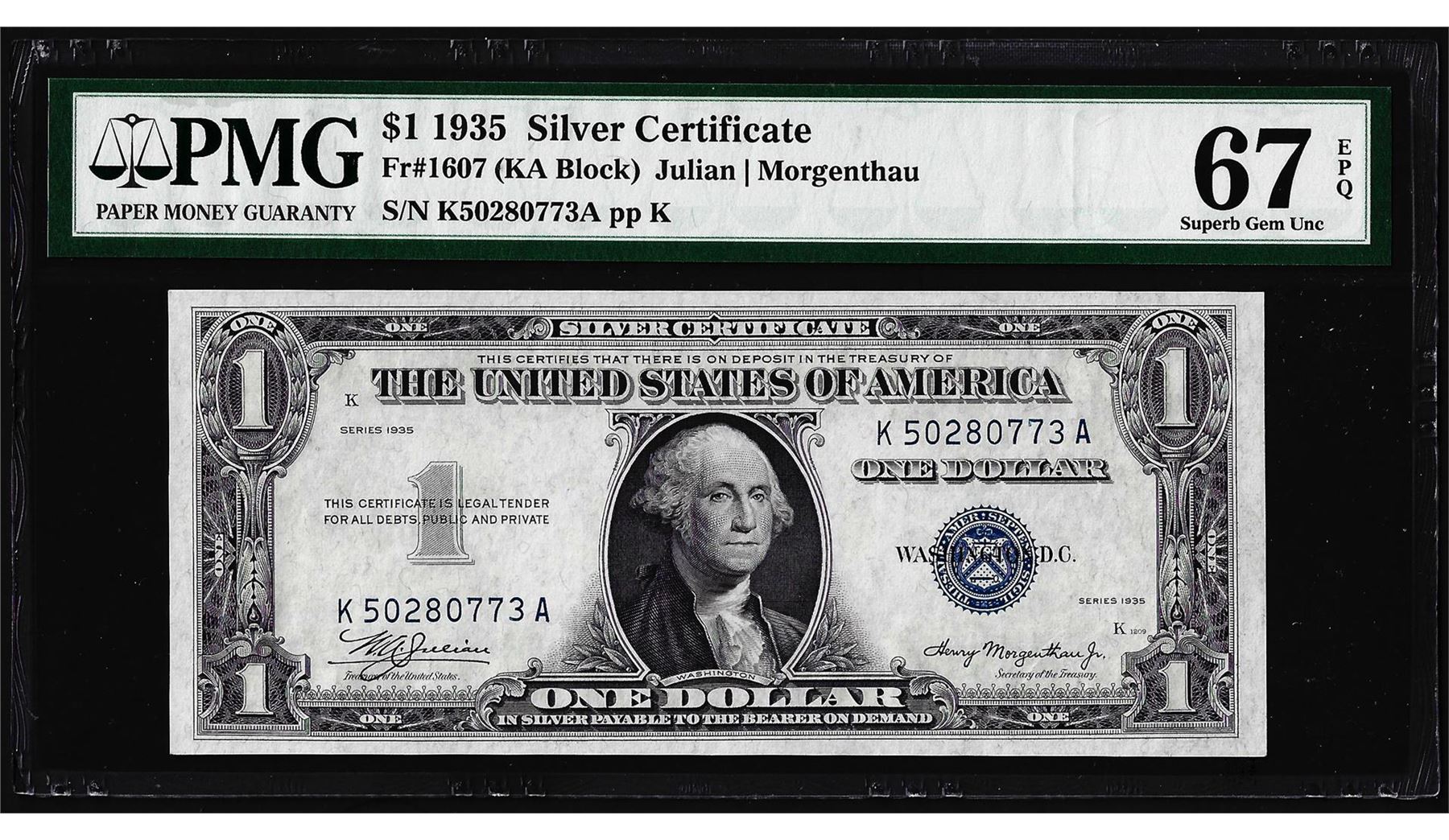 One 1935 $1 Silver Certificate Note Fr.1607 PMG Superb Gem Uncirculated 67EPQ. PMG Certified.