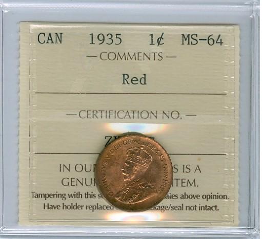 1935 1¢ Small ICCS MS-64 RED, 90% RED LUSTRE.