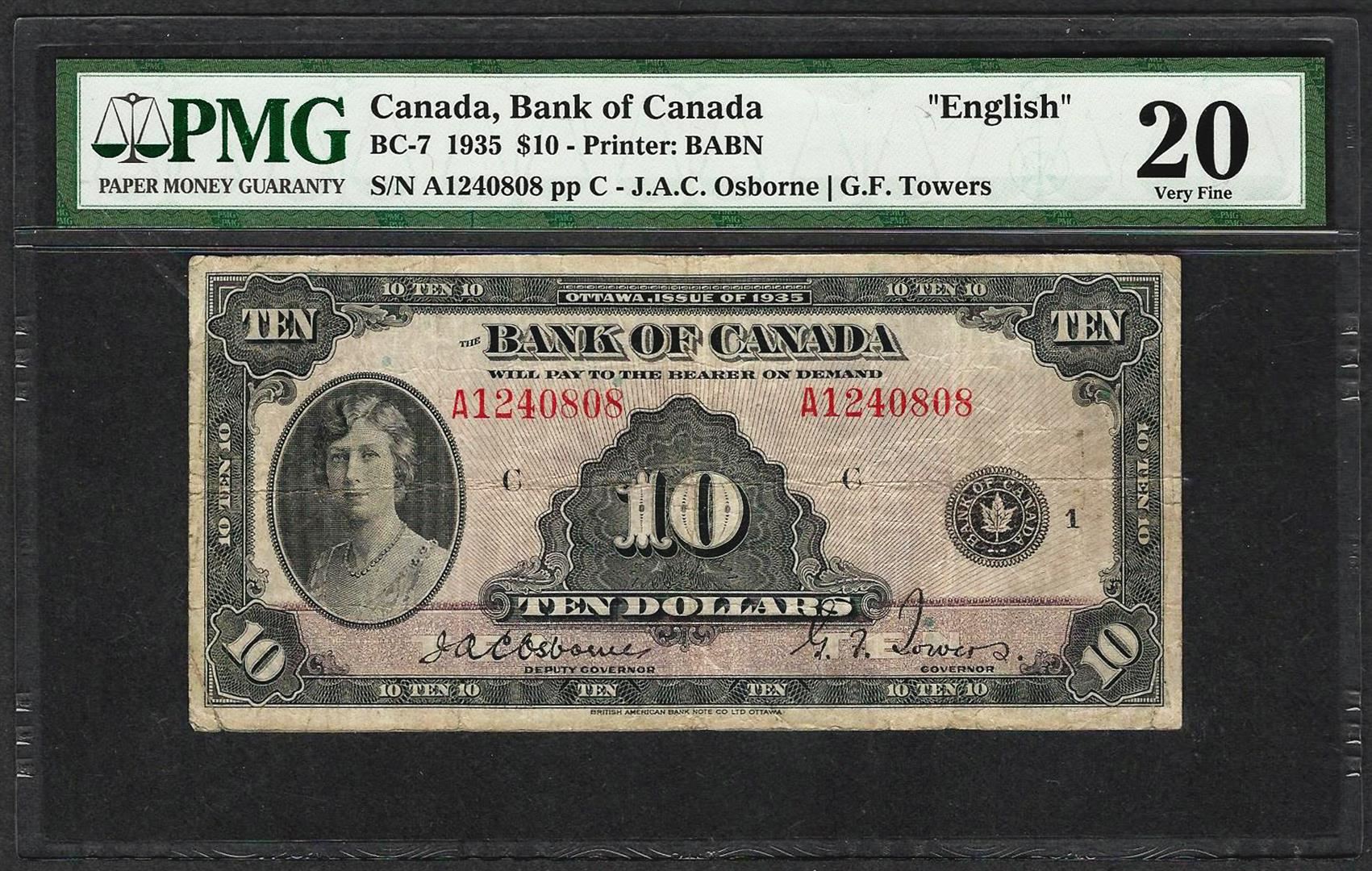 One 1935 $10 Bank of Canada "English" Bank Note BC-7 PMG Very Fine 20. PMG Certified.