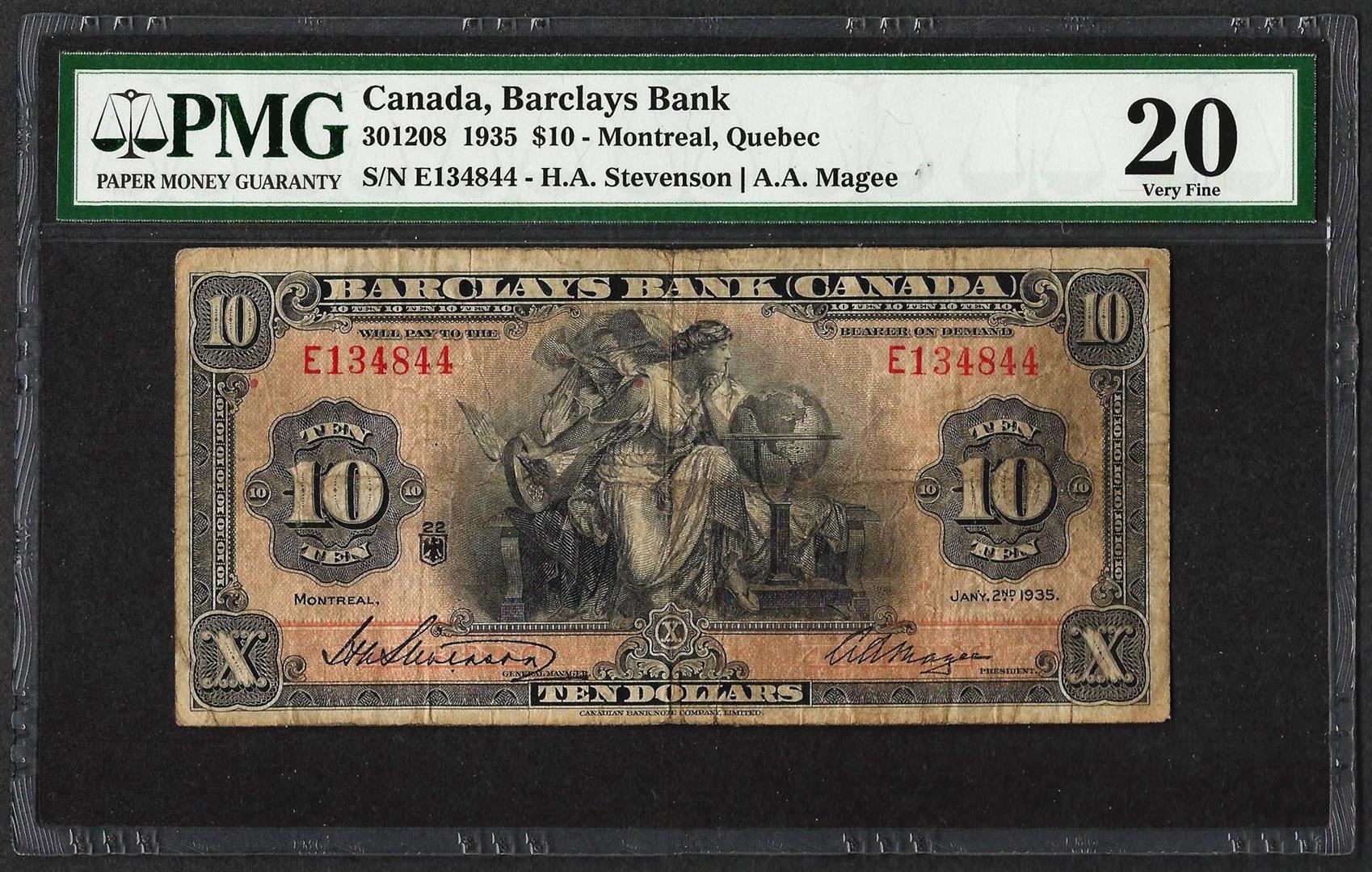 One 1935 $10 Barclays Bank Canada Montreal, Quebec Note PMG Very Fine 20. PMG Certified.