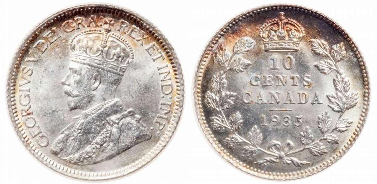 1935 10¢ ICCS MS65. Gem low mintage issue showing fabulous lustre and hint of gold rim tones.