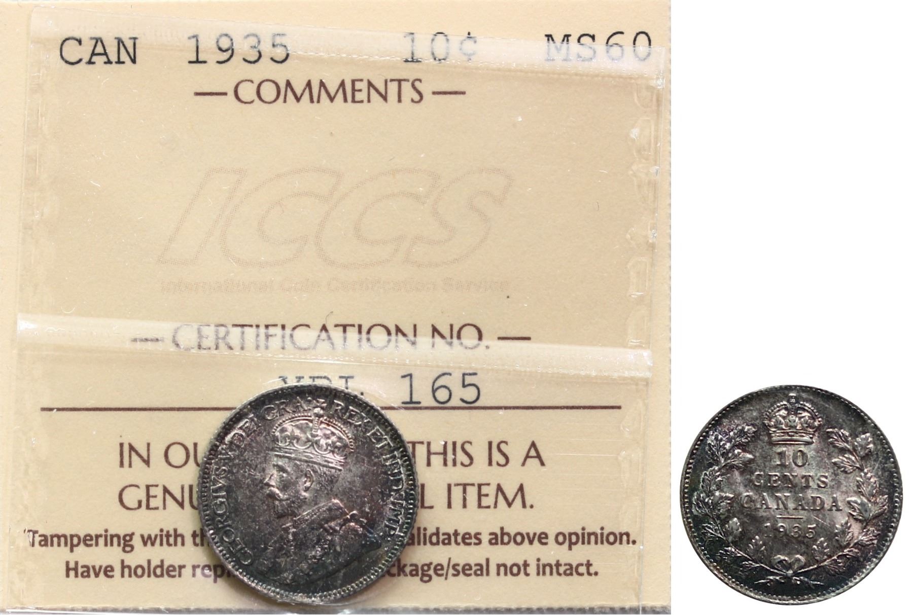 1935 10¢ ICCS Mint State-60 Attractive toning over underlying lustre.
