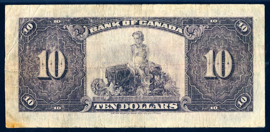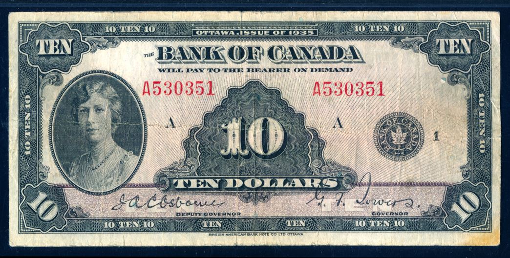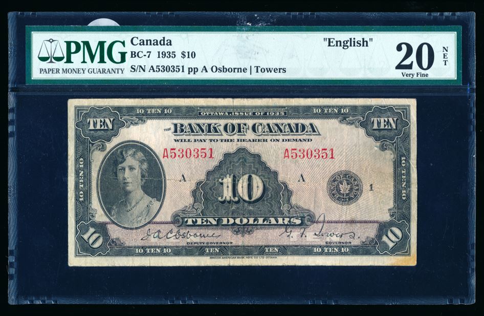 Bank of Canada, Ten Dollars, 1935, English Text, BC-7, graded PMG VF-20, with a few comments, namely, "Rust, Split, Erasure". Let's net it out as a Fine.