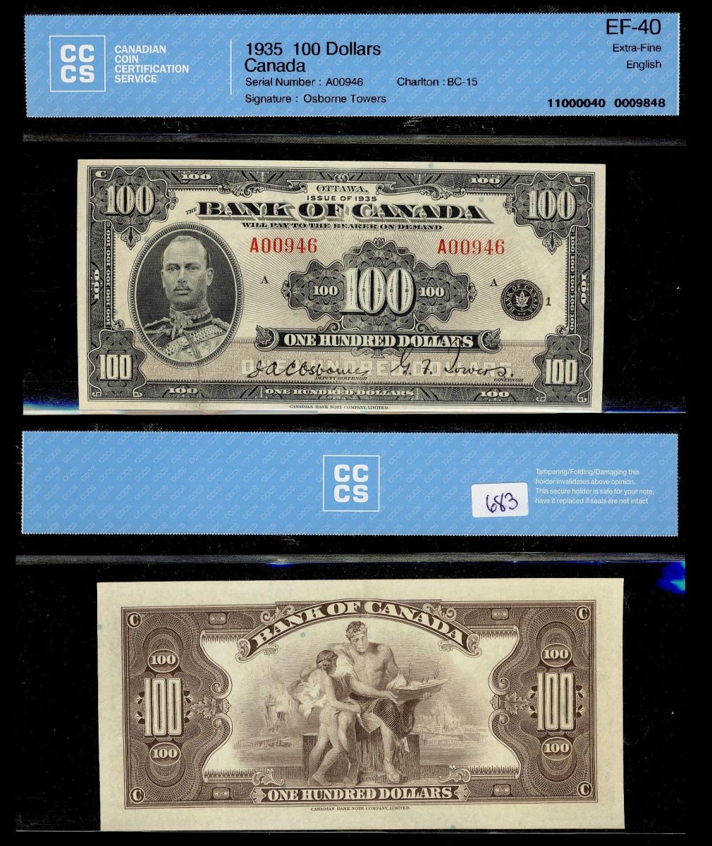 1935 $100 BC-15 #A00946 CCCS EF40. Very well centered and clean. A lovely example