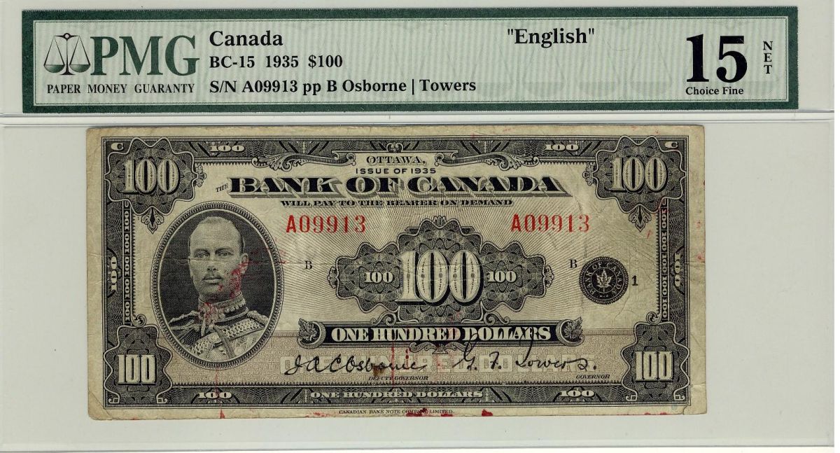 1935 $100 BC-15 #A09913 PMG F15 NET Corner Tear, Ink