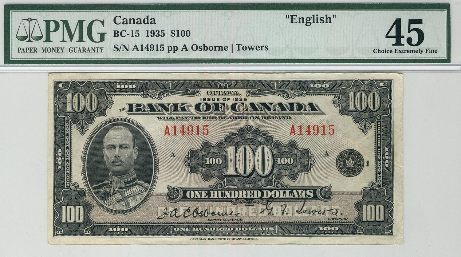 1935 $100 BC-15 A14915 PMG EF45, VIBRANT COLOURS AND VERY BRIGHT. Looks choice.
