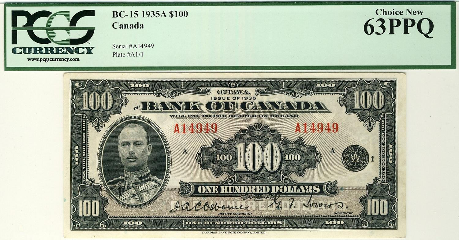 1935 $100 BC-15 A14949 PCGS UNC63PPQ. Excessively rare in Choice condition. Best one seen by the cataloger. Worth a premium bid.