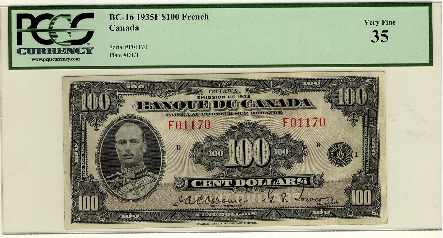 1935 $100 BC-16 F01170 PCGS VF35, should have been called EF. Bright with vibrant colours. Rare.