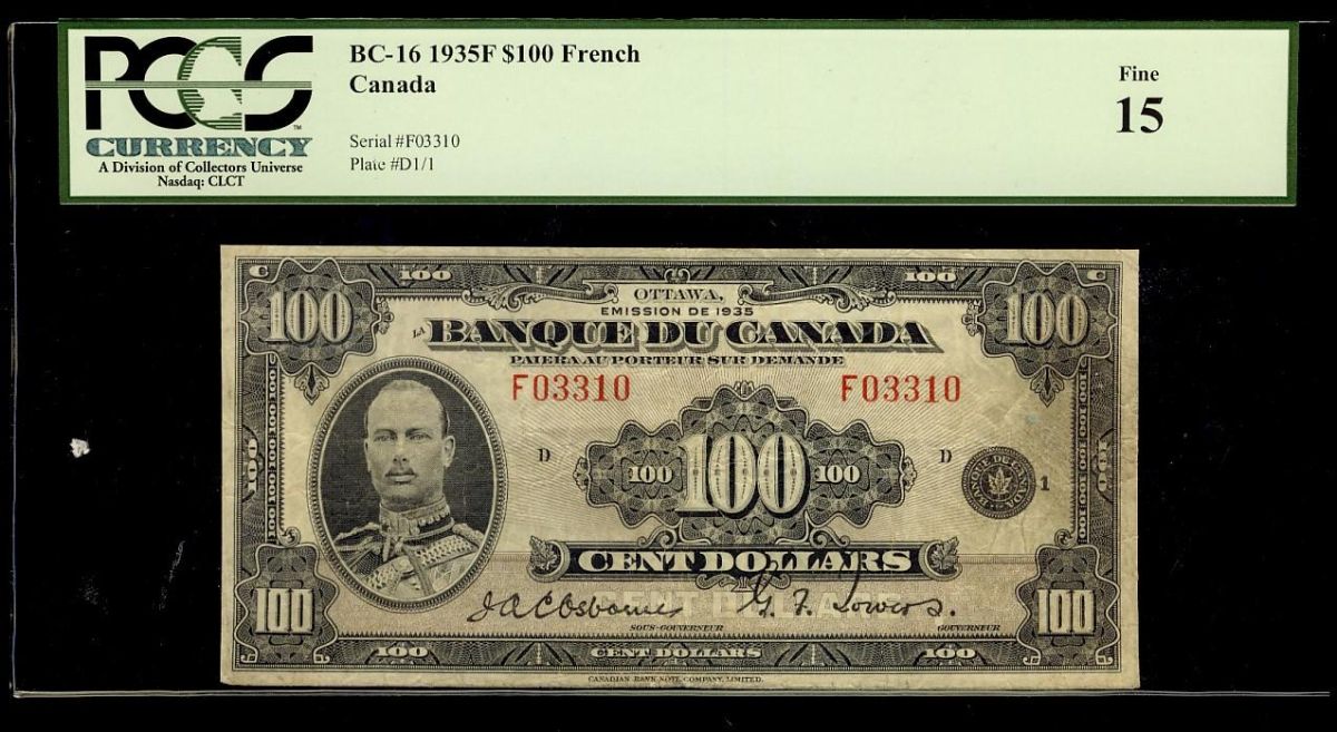 1935 $100 BC-16 #F03310 PCGS F15. French text. A nice and affordable example. Scarce!