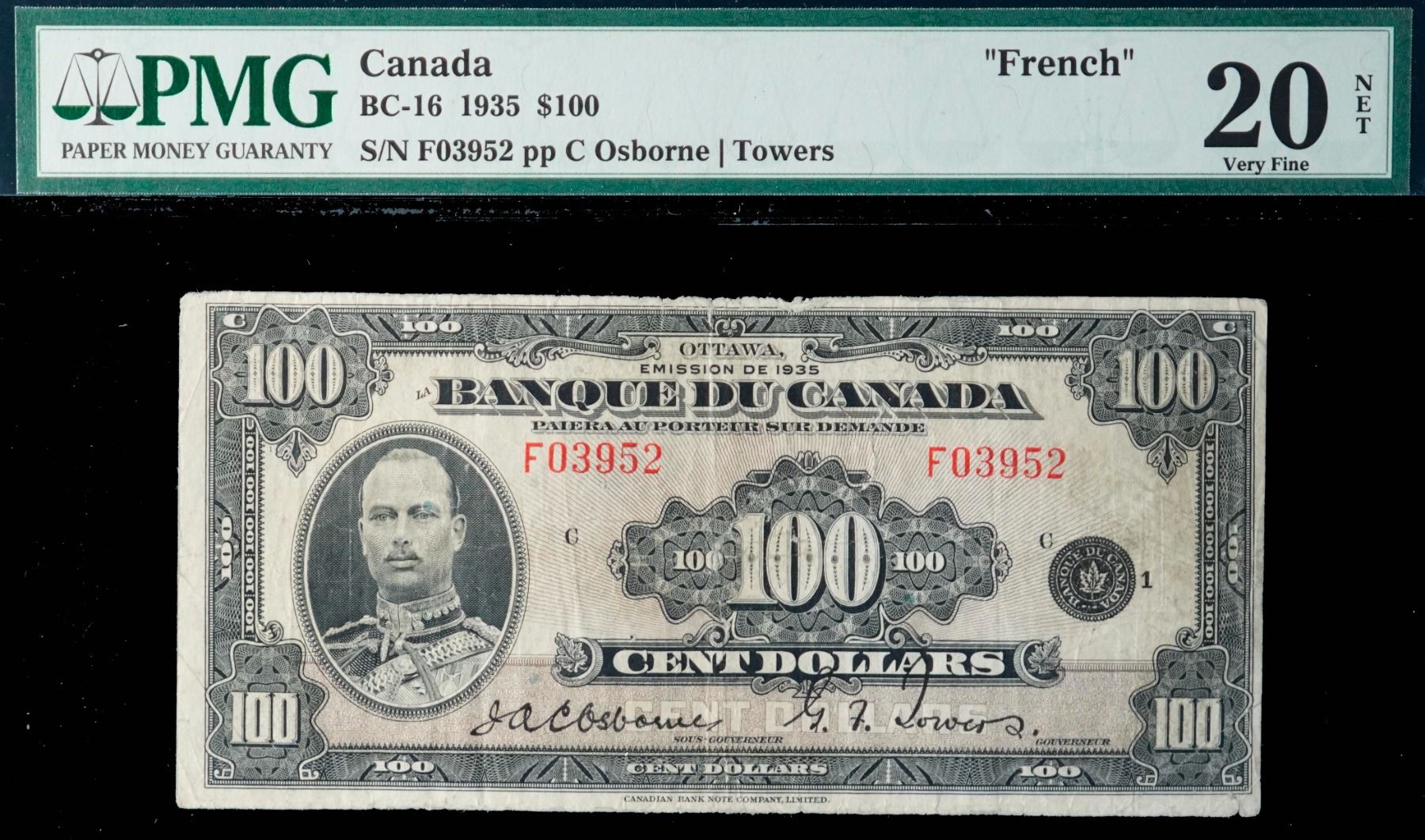 1935 $100 BC-16 F03952 PMG Very Fine-20 Minor issues. A nice and very attractive example. Extremely scarce and rarely offered in any condition. Pop. Only 66 notes recorded.