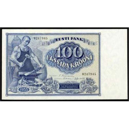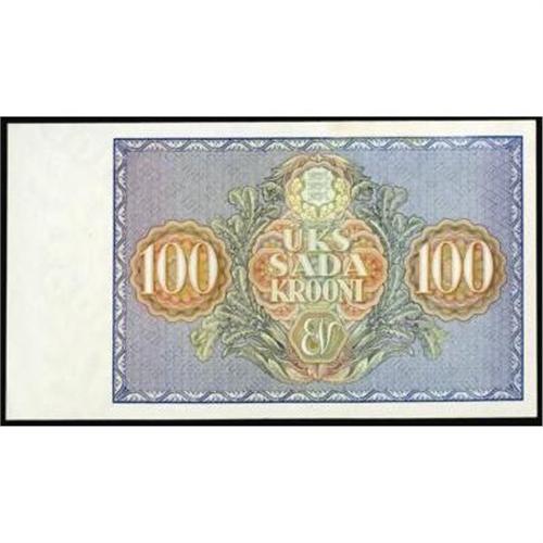 <style type="text/css"> body, td, th { font-family: Arial, Helvetica, sans-serif; font-size: 12px; color: #482424; margin: 0px; padding: 0px; } #header { background-image: url(http://www.bowersandmerena.com/ebay/images/template_v3_01.gif); clear: both; background-color: #590303; border-top-width: 2px; border-top-style: solid; border-top-color: #B38C4F; } #header #header_wrapper { height: 75px; clear: both; width: 800px; margin-right: auto; margin-left: auto; background-image: url(http://www.bowersandmerena.com/ebay/images/template_v3_03.gif); background-repeat: no-repeat; background-position: right; color: #F3EDCC; } #header #header_wrapper #header_logo { float: left; height: 75px; width: 444px; background-image: url(http://www.bowersandmerena.com/ebay/images/template_v3_02.gif); background-repeat: no-repeat; font-size: 10px; text-transform: capitalize; color: #B38C4F; } #header #header_wrapper #header_right { float: left; height: 75px; width: 356px; text-align: right; } #header #header_wrapper #header_right #headerLoginBtn { margin-bottom: 30px; } #header #header_wrapper #header_right input#txtSearch { color: #B49056; border: 1px solid #B49056; width: 175px; padding-top: 3px; padding-right: 3px; padding-bottom: 4px; padding-left: 3px; } #nav { height: 37px; background-image: url(http://www.bowersandmerena.com/ebay/images/template_v3_05.gif); clear: both; } #nav #nav_wrapper { height: 35px; width: 800px; margin-right: auto; margin-left: auto; border-left-width: 1px; border-left-style: solid; border-left-color: #B38C4F; } #nav #nav_wrapper a { padding-right: 15px; padding-left: 15px; border-right-width: 1px; border-right-style: solid; border-right-color: #B38C4F; height: 25px; padding-top: 10px; display: block; float: left; text-decoration: none; font-weight: bold; color: #5D0303; } #nav #nav_wrapper a:hover { color: #B38C4F; } #nav #nav_wrapper #search { float: right; padding-top: 7px; } #nav #nav_wrapper #search #txtSearch { font-family: Arial, Helvetica, sans-serif; font-size: 10px; text-transform: uppercase; color: #D2AE75; border: 1px solid #B38C4F; padding: 3px; } #content_bgd { background-image: url(http://www.bowersandmerena.com/ebay/images/template_v3_09.gif); background-repeat: repeat-y; background-position: center; padding-top: 15px; padding-bottom: 15px; background-color: #FBFBDB; } #content_wrapper { clear: both; height: auto; width: 800px; margin-right: auto; margin-left: auto; } .LotDetailWhite { line-height:normal; font-size:13px; font-family: arial,helvetica,sans-serif; color: White; font-weight: bold; } .LotDetailInformation { line-height:normal; font-size: 13px; font-family: arial,helvetica,sans-serif; } .LotDetailMessage { line-height:normal; font-size: 13px; font-family: arial,helvetica,sans-serif; color: red; } } tr.HeaderAuctionTitle td { color: #000000; font-weight: bold; padding: 2px; background-image: url(http://www.bowersandmerena.com/ebay/images/template_v3_05.gif); background-repeat: repeat-x; border-bottom-width: 1px; border-bottom-style: solid; border-bottom-color: #B38C4F; } table.AuctionSummary a, table.AuctionSummary a:link, table.AuctionSummary a:visited { color: #0000FF; text-decoration: none; } } td.tableHeaderLeft { border-left-width: 1px; border-left-style: solid; border-left-color: #B38C4F; } td.tableHeaderRight { border-right-width: 1px; border-right-style: solid; border-right-color: #B38C4F; } td.tableCellMiddle { border-left-width: 1px; border-left-style: solid; border-left-color: #B38C4F; border-right-width: 1px; border-right-style: solid; border-right-color: #B38C4F; padding: 5px; } tr.footer td { border-top-width: 1px; border-top-style: solid; border-top-color: #B38C4F; } </style> </head> <body> <div id="header"> <div id="header_wrapper"> <div id="header_logo"> </div> <div id="header_right"> </div> </div> </div> <div id="nav"> <div id="nav_wrapper"> <a href="http://www.bowersandmerena.com">Our eBayLive Auctions</a> <a href="#PaymentInfo">Payment Information</a> <a href="#ShippingInfo">Shipping Information</a> <a href="#About">About Bowers and Merena</a> </div> </div> <div id="content_bgd"> <div id="content_wrapper"> <table width="100%" border="0" cellpadding="5" cellspacing="0" class="AuctionSummary"> <tbody> <tr class="HeaderAuctionTitle" style="height: 25px;"> <td align="left" class="tableHeaderLeft" > </td> <td align="center" class="tableHeaderRight"> <span style="font-size: large;">Lot #2720. Estonia. 1935 100 Krooni. Bank of Estonia. Unc.</span> </td> </tr> <tr> <td colspan="3" class="tableCellMiddle"> P-66a. This wonderfully bright and fully Uncirculated note has great appeal and will surely please any collector seeking the type. A bright reverse in multi-colored ink is worked into a striking underprint and geometric devices. This is an instance in where the issued note is more scarce then the Specimen which we offer in the next lot.