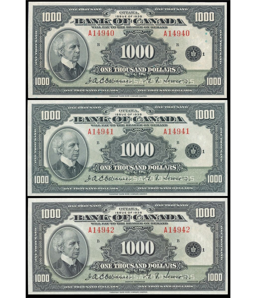 1935 $1000 BC-19 #A14940, RADAR #14941 & 14942. Lot of 3 consecutive notes including a RARE RADAR issue for type. Notes grade PMG Gem UNC65EPQ first two & CH UNC64EPQ for the third issue.