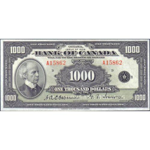 1935 One Thousand Dollars English, BC-19 Serial Number A15862 D. Very slightly off centre toward the top and right, PMG Gem Uncirculated 65 Exceptional Paper Quality