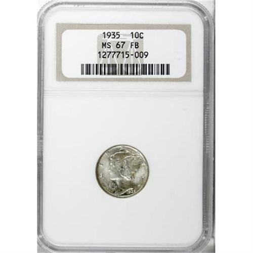 <B>1935 10C MS67 Full Bands NGC.</B></I> NGC Census: (111/1). PCGS Population (193/5). Mintage: 58,830,000. Numismedia Wsl. Price for NGC/PCGS coin in MS67: $240. (#4993)<BR><BR><B>Coin Engraver:</B> Adolph A. Weinman<BR><BR><b>Shipping:</b> Coins & Currency (<a target="_blank" href="http://www.heritageauctions.com/common/shipping.php">view shipping information</a>)
