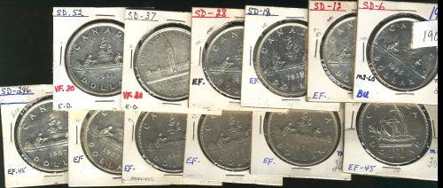 1935, 1936, 1937, 1938, 1939, 1946, 1949, 1950 SWL, 1951, 1951 SWL, 1957 1 WL, 1957 WL. Grades are EF or better. Lot of 12 pieces.