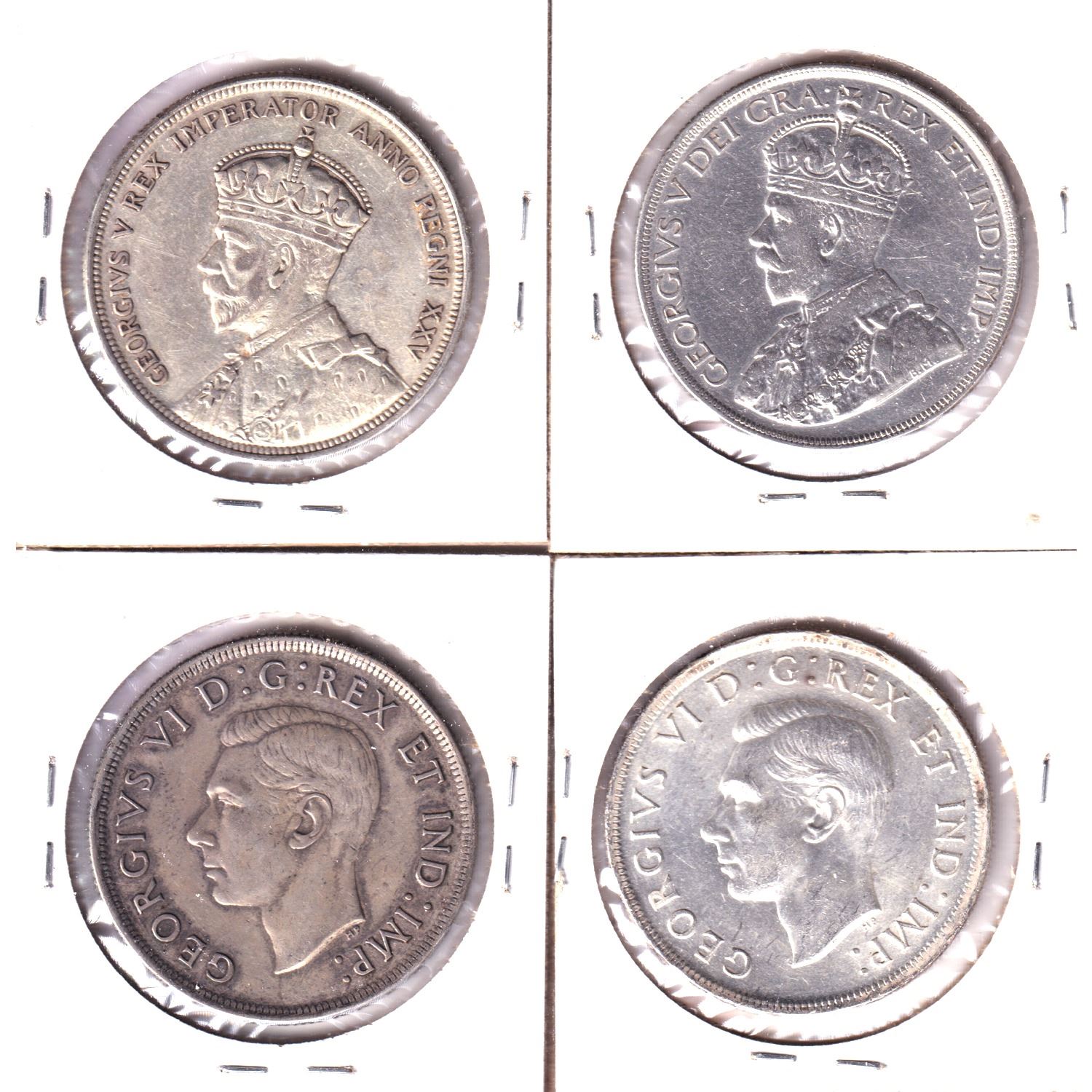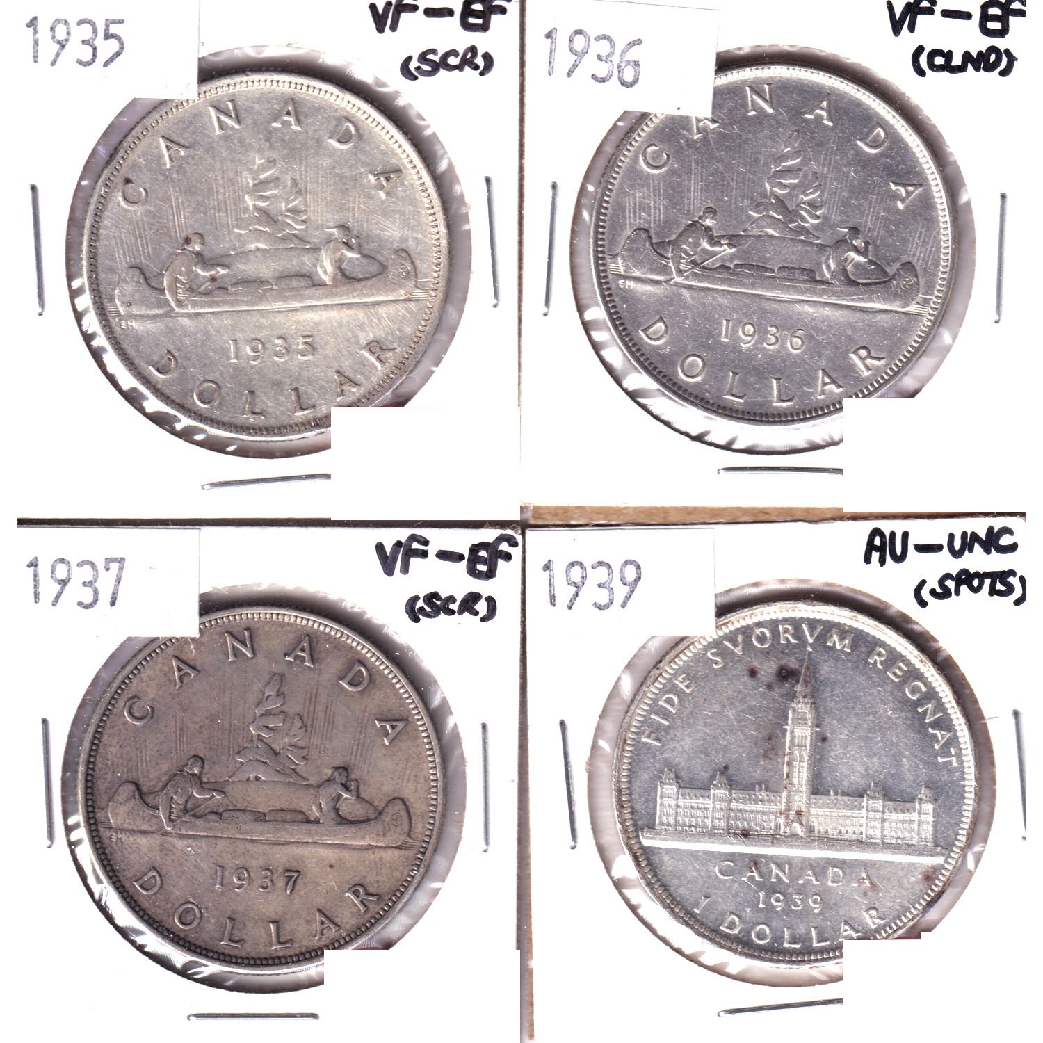 1935,1936,1937 & 1939 Canada Silver Dollars in VF or Better Condition. Coins contain various imperfections. Please view image for details. 4pcs