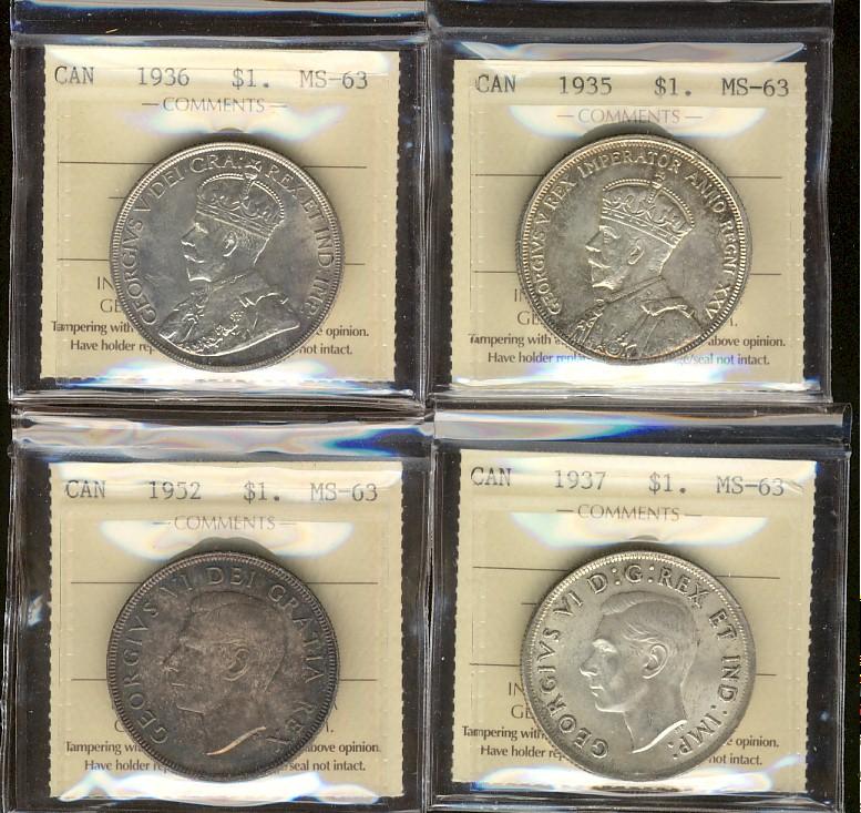 1935, 1936, 1937, 1952 NWL, $1 all ICCS MS63, Lot of 4 coins,