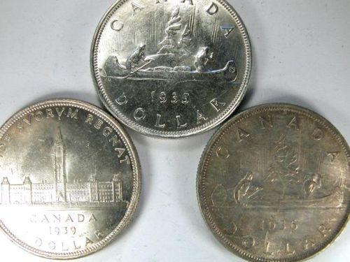 Canada Silver Dollar 1935, 1936 and 1939, all Uncirculated to Choice Uncirculated. Three pale to lightly toned pieces