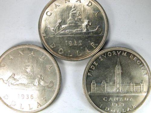 Canada Silver Dollar 1935, 1936 and 1939, all Uncirculated to Choice Uncirculated. Three pale toned pieces