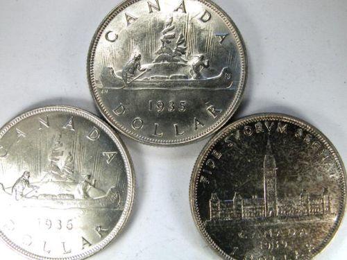Canada Silver Dollar 1935, 1936 and 1939, all Uncirculated to Choice Uncirculated. Three pale toned pieces