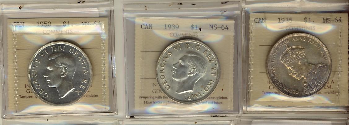 1935, 1939 & 1950 $1 ICCS MS64. Lot of 3 coins.