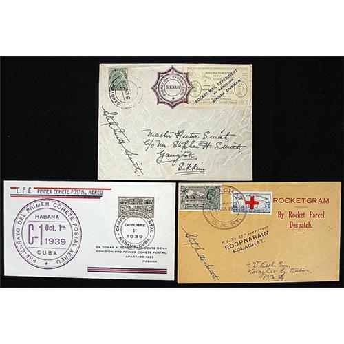 <Our item number 139770><B>1935/1939, "Rocket Mail" Covers/Cards.</B> Lot of three different pieces including an October 1, 1939 Cuba flown cover (E-Z No. 1C1, cat. $350) with only 60 covers flown (tape mounts on reverse), a June 6, 1935 Indian flown card (E-Z No. 11C1, cat. $200) with only 110 cards flown and an April 9, 1935 Sikkim flown cover (E-Z No. 4C1, cat. $150) with only 175 covers flown (some wrinkles/soil). All are properly cancelled and in good overall condition. A great classic lot. <BR>Estimated Value $250 - 350. <BR><BR>Our item number 139770<BR><IMAGES><P ALIGN="CENTER"><IMG SRC="http://www.goldbergcoins.net/liveauction/49jpegs/139770.jpg"> </P></IMAGES>
