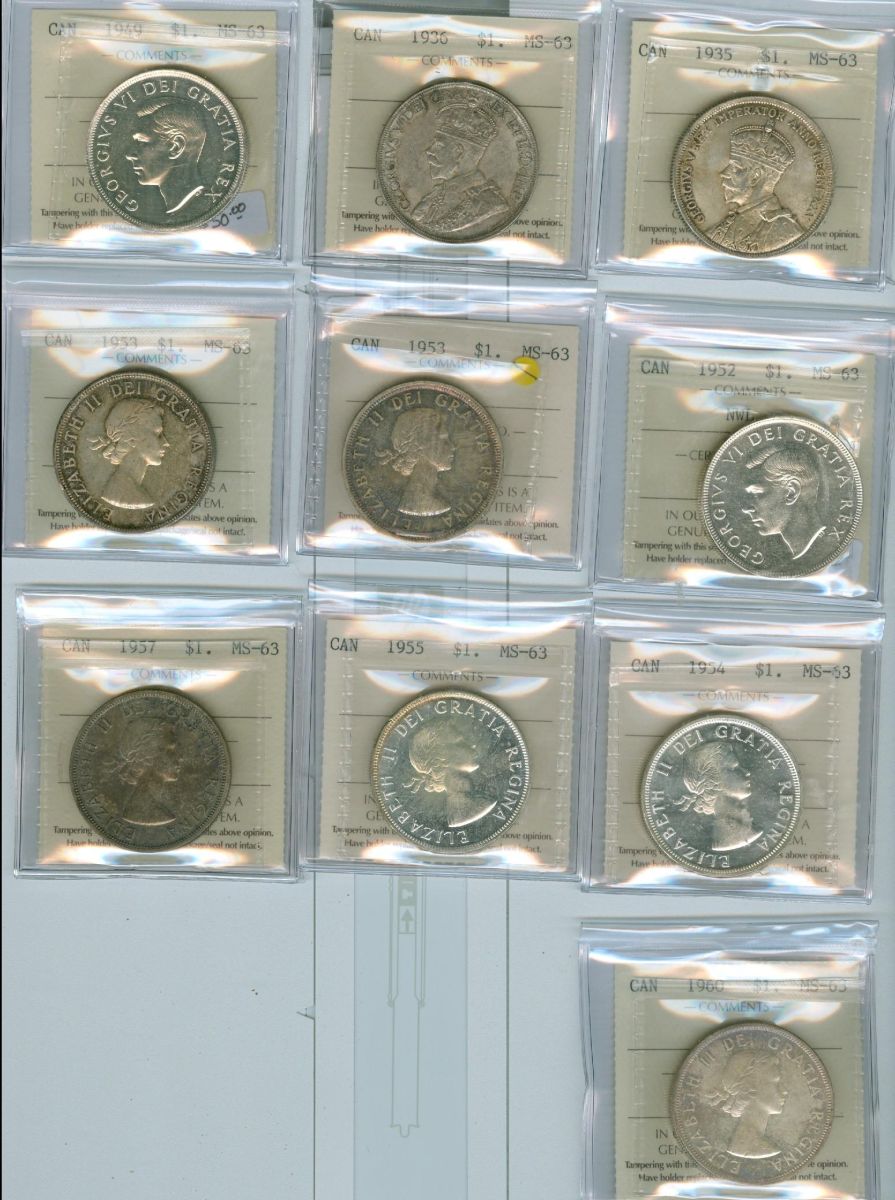 1935-1960 $1 ICCS MS63. Lot of 10 coins including 1935, 1936, 1949, 1952 NWL, 1953 SF, 1953 NSF, 1954, 1955, 1957 and 1960.