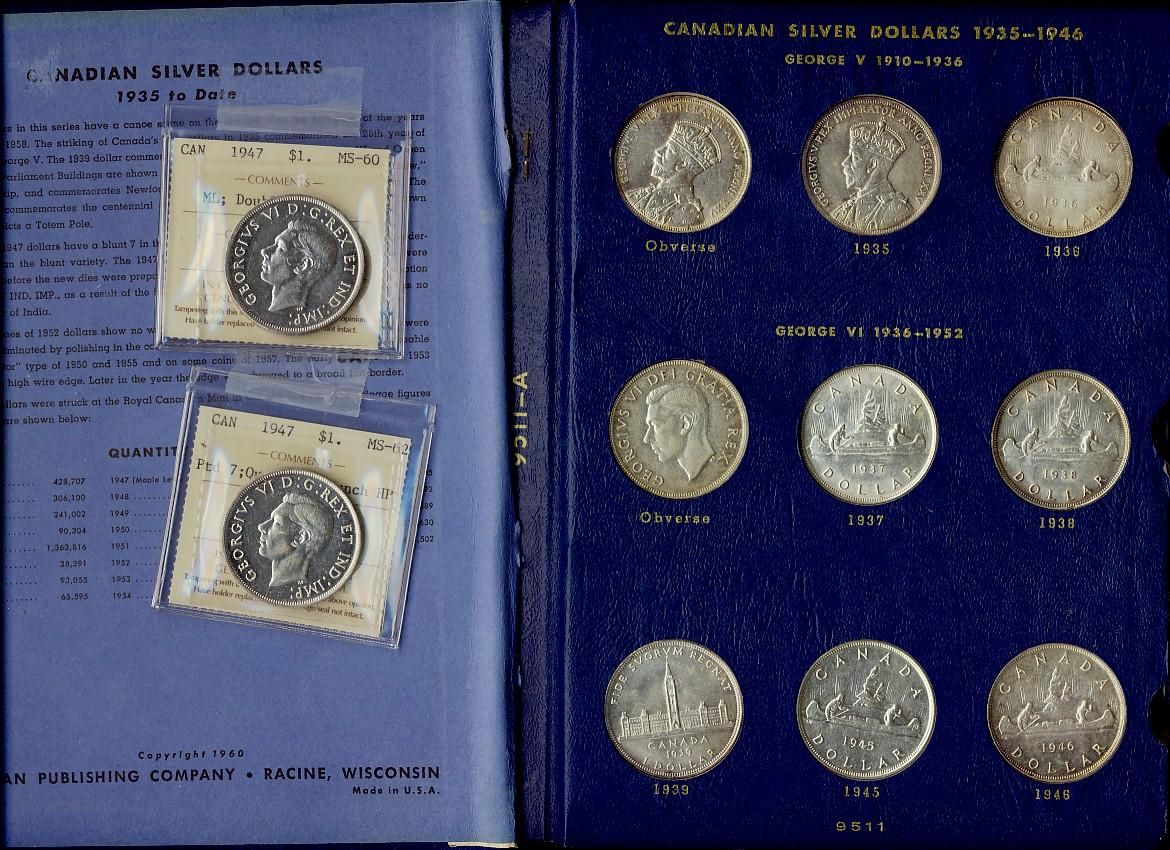1935 - 1967 $1 Collection. Collection Housed in old blue Whitman holder. Set comes complete with 2 individual coins in ICCS holders, 1947 Ptd 7 Quad ICCS MS62 and 1947 ML Dbl HP ICCS MS60. Coins grade EF to BU. Should be viewed.
