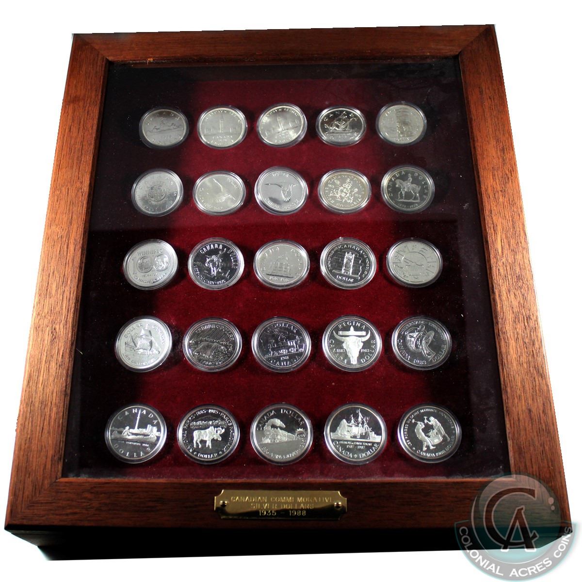 *1935-1988 Canada Commemorative Silver Dollar Collection in Deluxe wooden Display. Collection includes the following Silver Dollars in BU, Proof or Specimen finish: 1935, 2x 1939, 1949, 1958, 1964 and 2x 1967, 1971-1979 & 1980-1988.