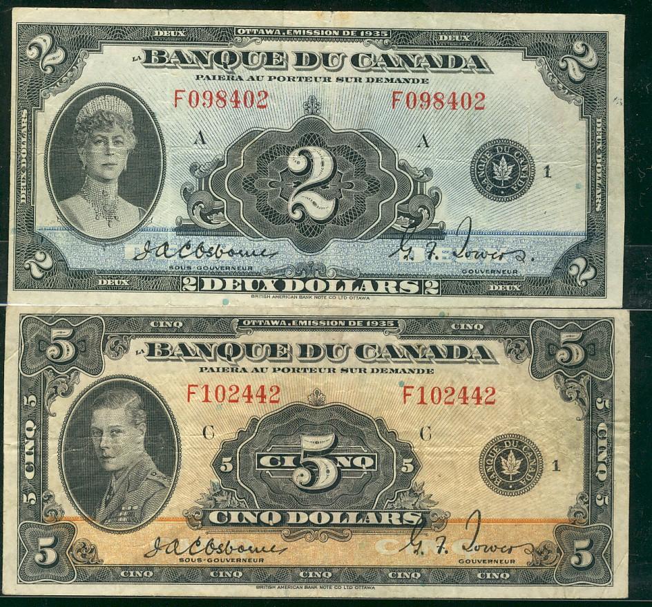 1935 $2 BC-4 #F098402 & $5 BC-6 #F102442. Lot of 2 french issues. Fine to F+ in grades.