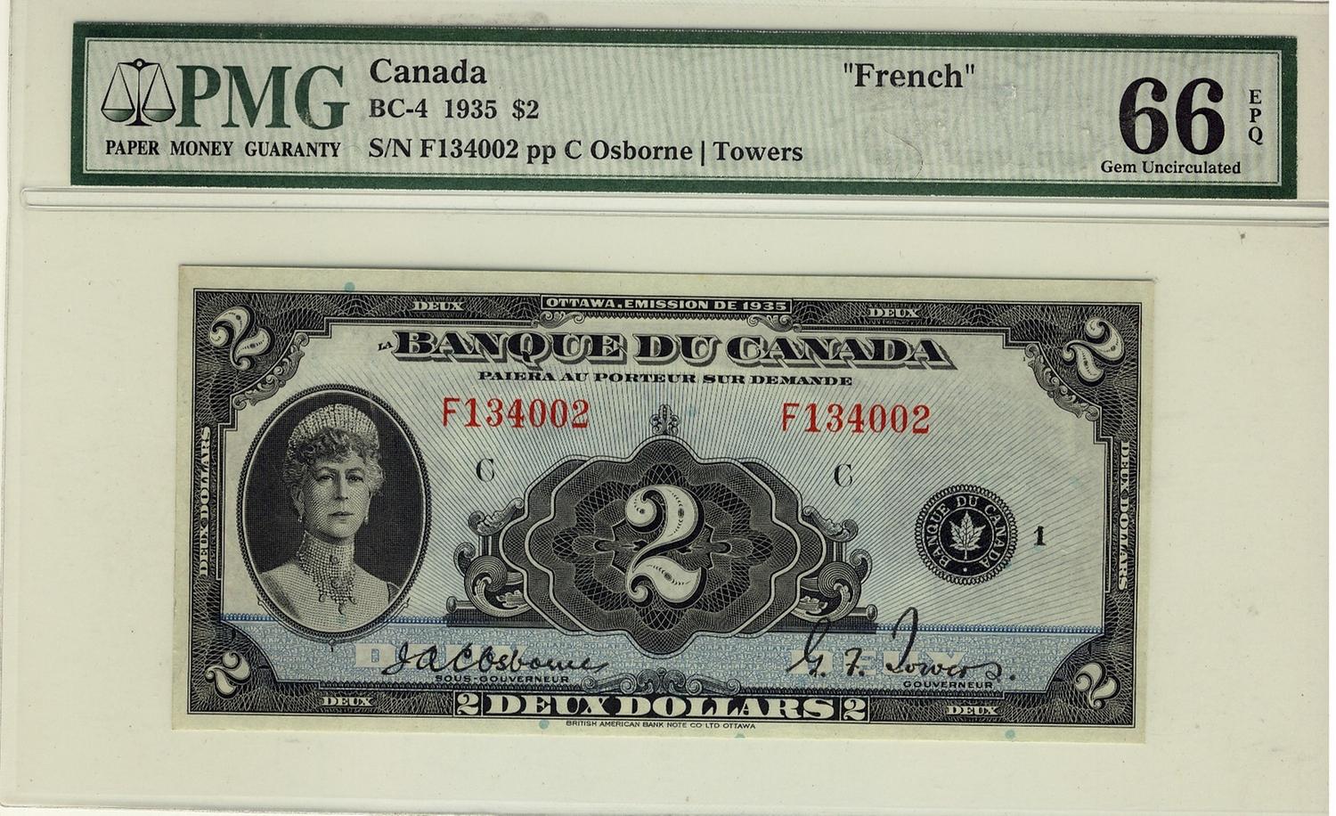 1935 $2 BC-4 #F134002, PMG Gem UNC66EPQ. Vibrant colours with great embossing. Excessively rare and desirable. Don't miss this opportunity to acquire another rarity. Worth a premium bid. Best example seen by TCNC.