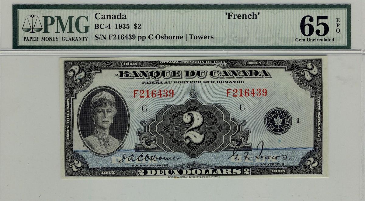 1935 $2 BC-4 F216439 PMG UNC65 EPQ. Vibrant colours with great embossing. Simply a splendid example, one of unforgettable quality and a highlight of this sale.