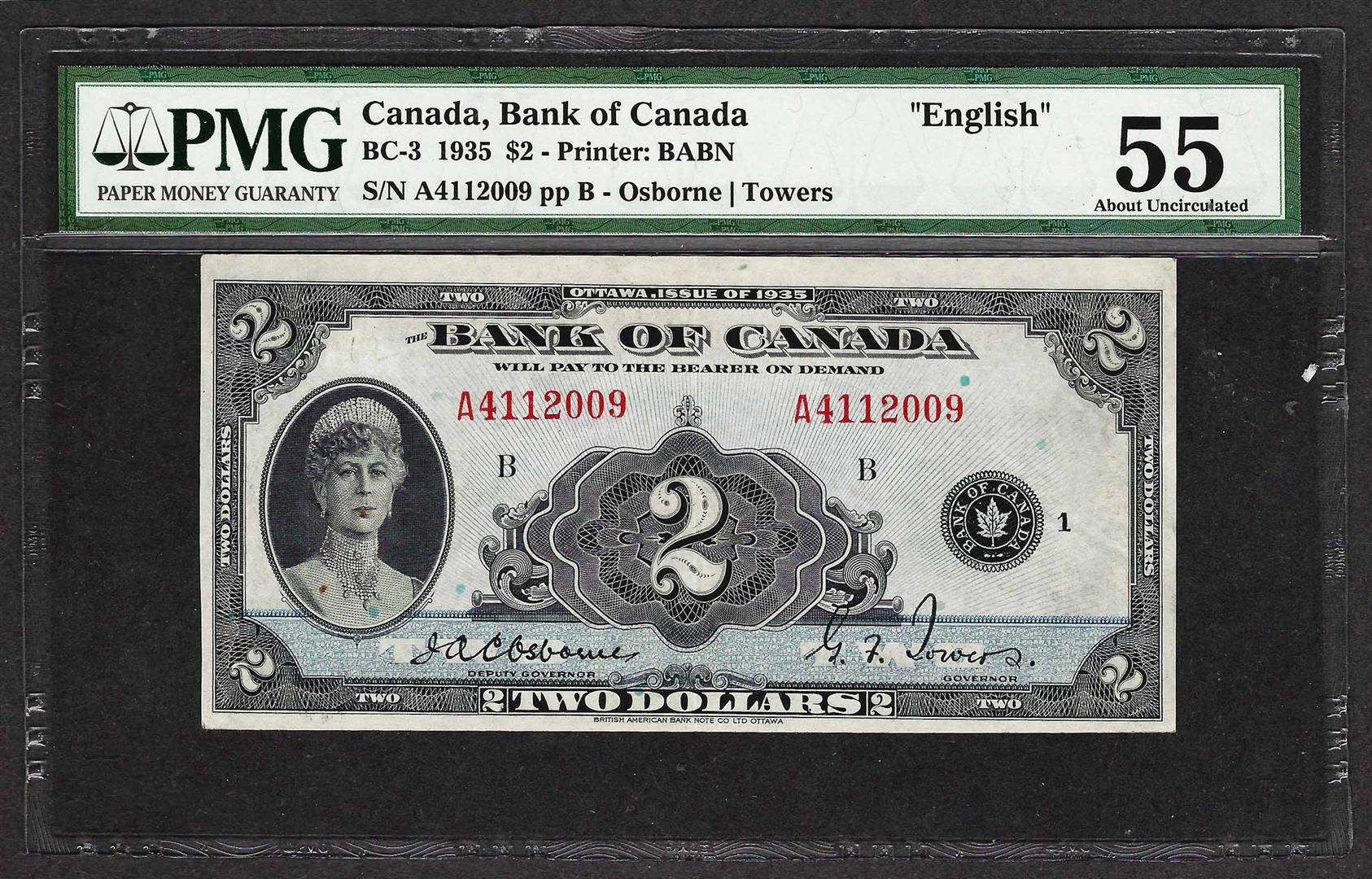 One 1935 $2 Bank of Canada Note English BC-3 PMG About Uncirculated 55. PMG Certified.