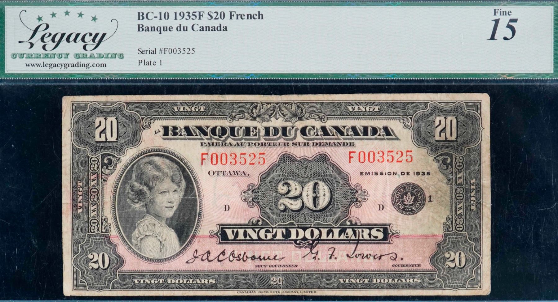 1935 $20 BC-10 #F003525 LCG Choice Fine-15, "French Text" minor issues.