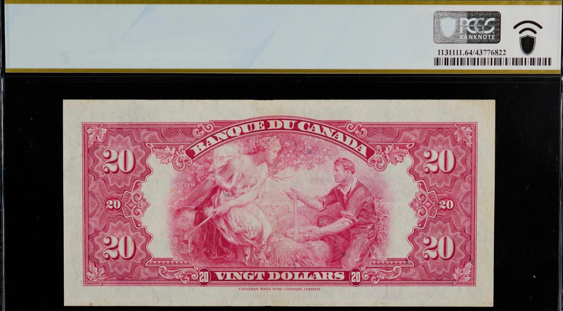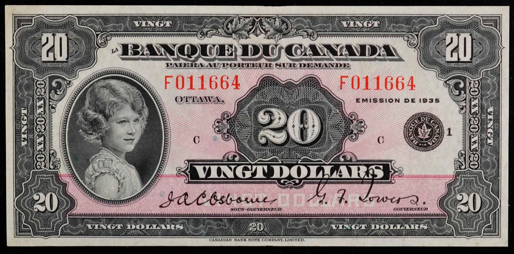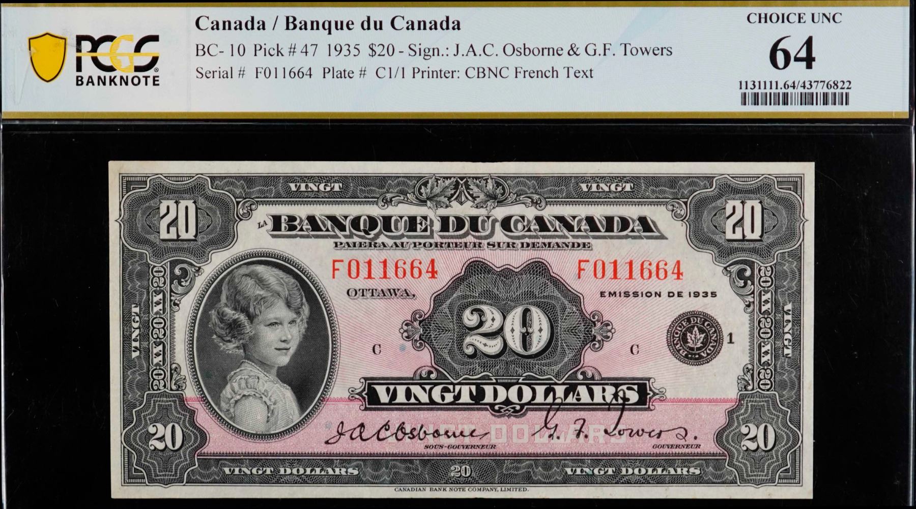1935 $20 BC-10 #F011664, PCGS Very Choice Uncirculated-64. Rare "French Text". The note is bright with superb centering and good colours. A must for the High end collector or investor. This is among the best examples seen and handled by TCNC. Another highlight of the 2025 RCNA Auction. Worth a premium bid.