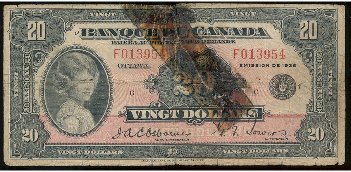 1935 $20 BC-10 #F013954. A better french issue, Repaired with dark glue residue. VG+ for grade.