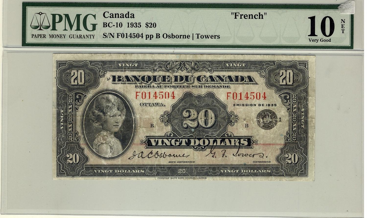 1935 $20 BC-10 #F014504, PMG VG10 Net. Designated as processed. Very faint tint of pink left.