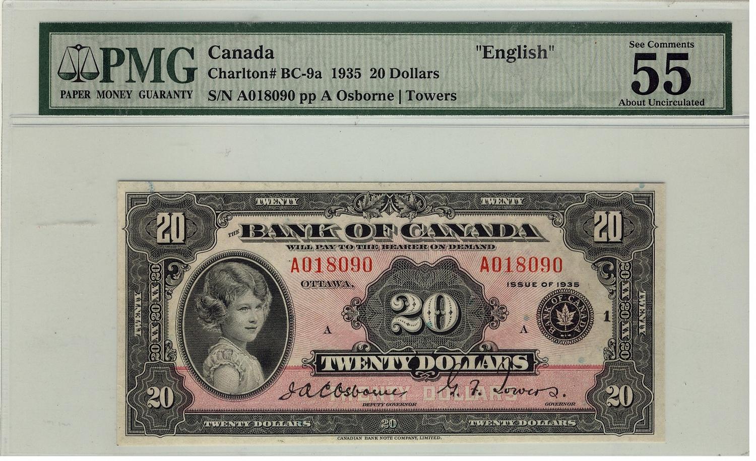 1935 $20 BC-9a #A018090, PMG CH AU55. Bright, attractive and well centered. A superb and near uncirculated example.