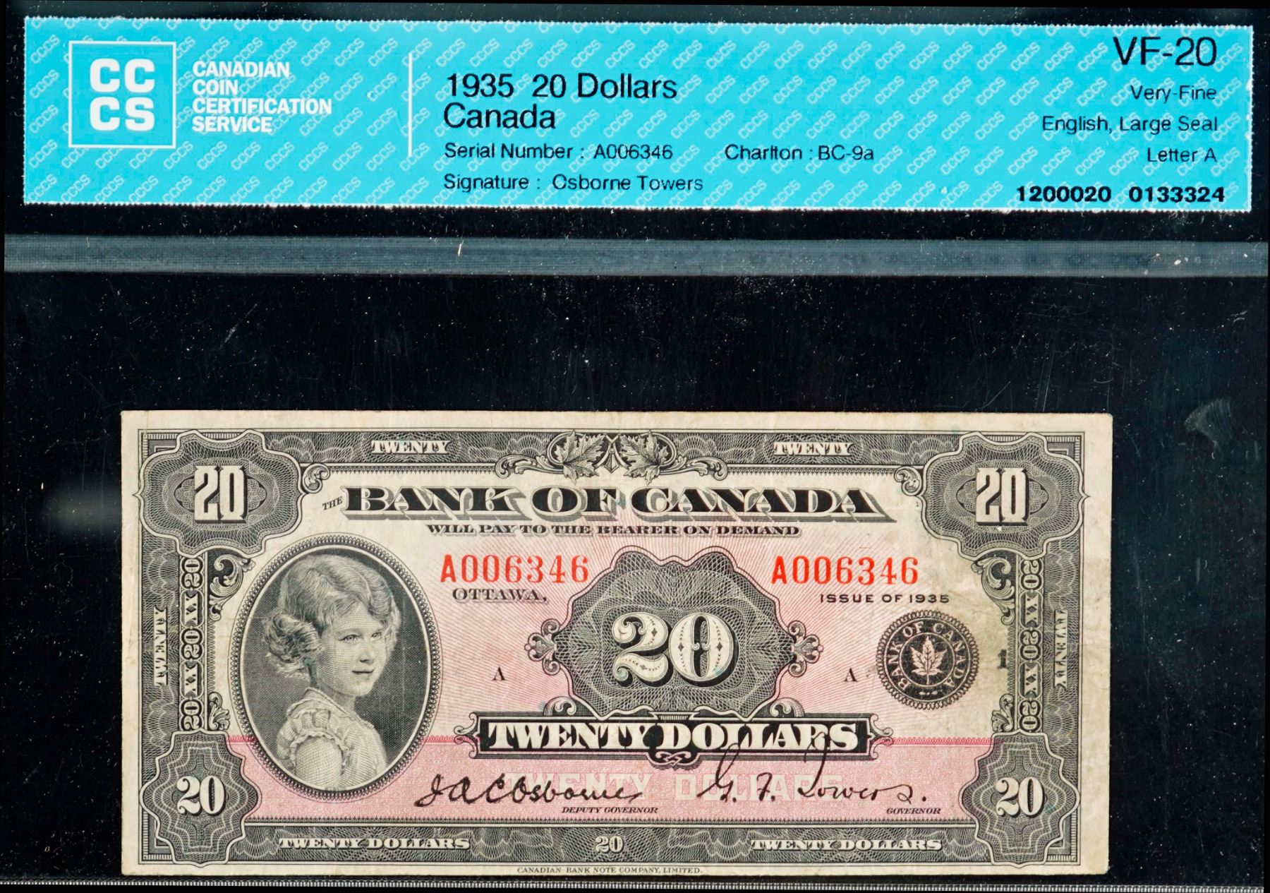 1935 $20 BC-9a "Large Seal" #A006346 CCCS Very Fine-20