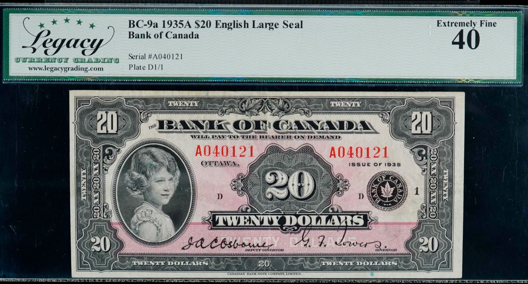1935 $20 BC-9a "Large Seal" #A040121 LCG Extra Fine-40, A bright and attractive example. Hard to find in this condiiton.