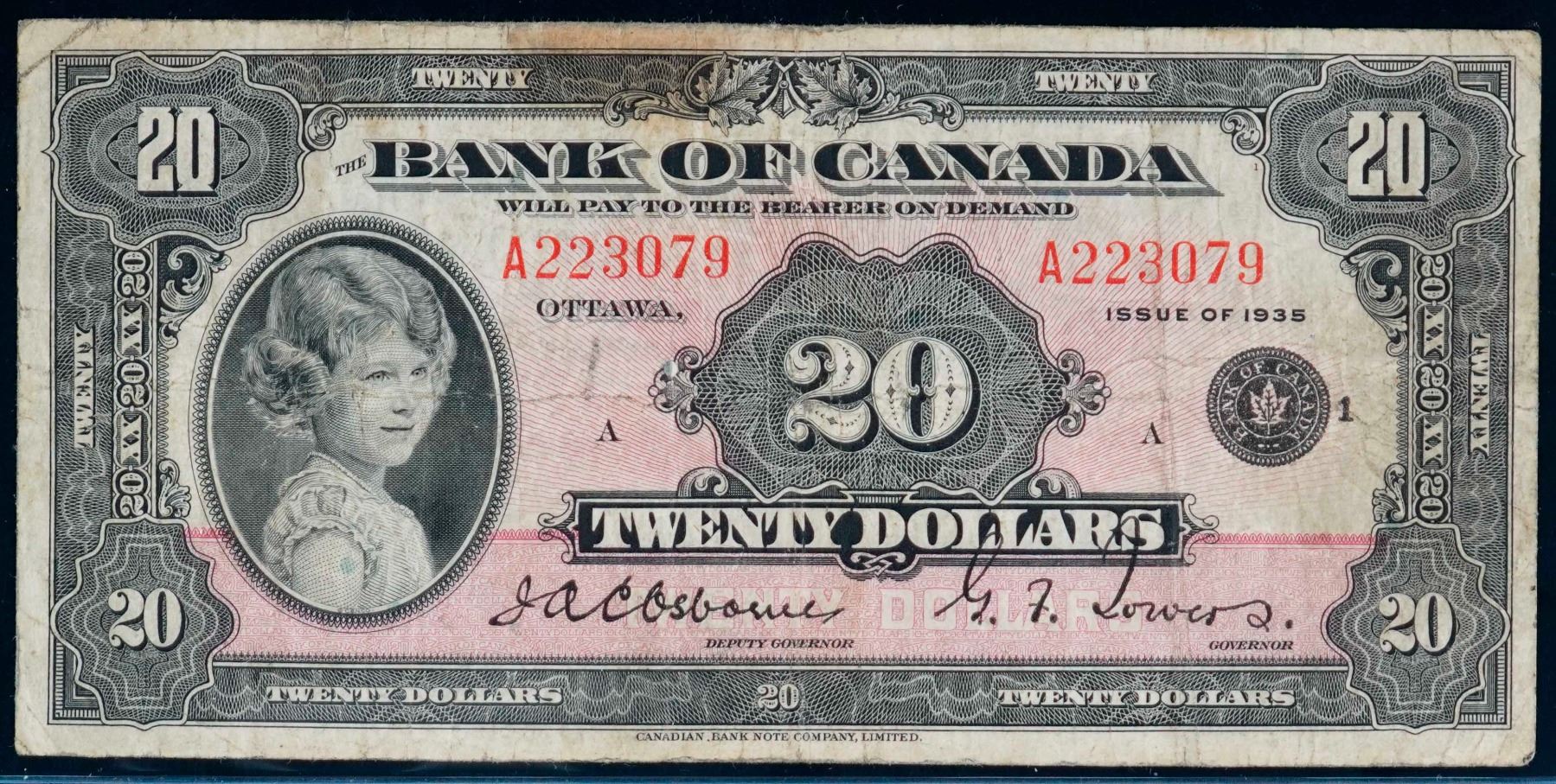 1935 $20 BC-9a "Large Seal" #A223079 Fine example.