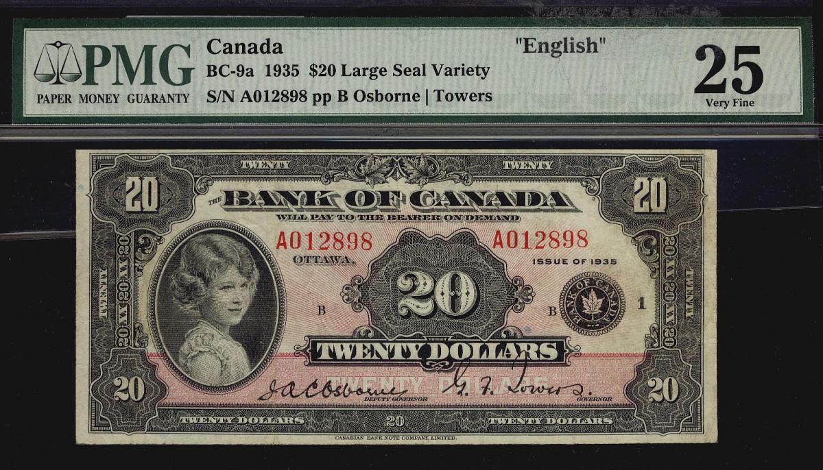 1935 $20 BC-9a Large seal S/N A012898 pp B PMG VF25